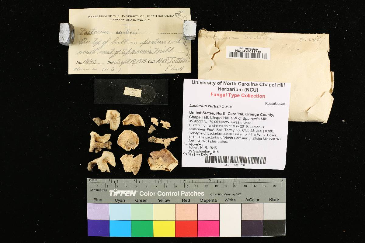 Holotype of Lactarius curtisii Coker, p. 41 in W. C. Coker. 1918. The Lactarias of North Carolina. J. Elisha Mitchell Sci. Soc. 34: 1-61 plus plates.