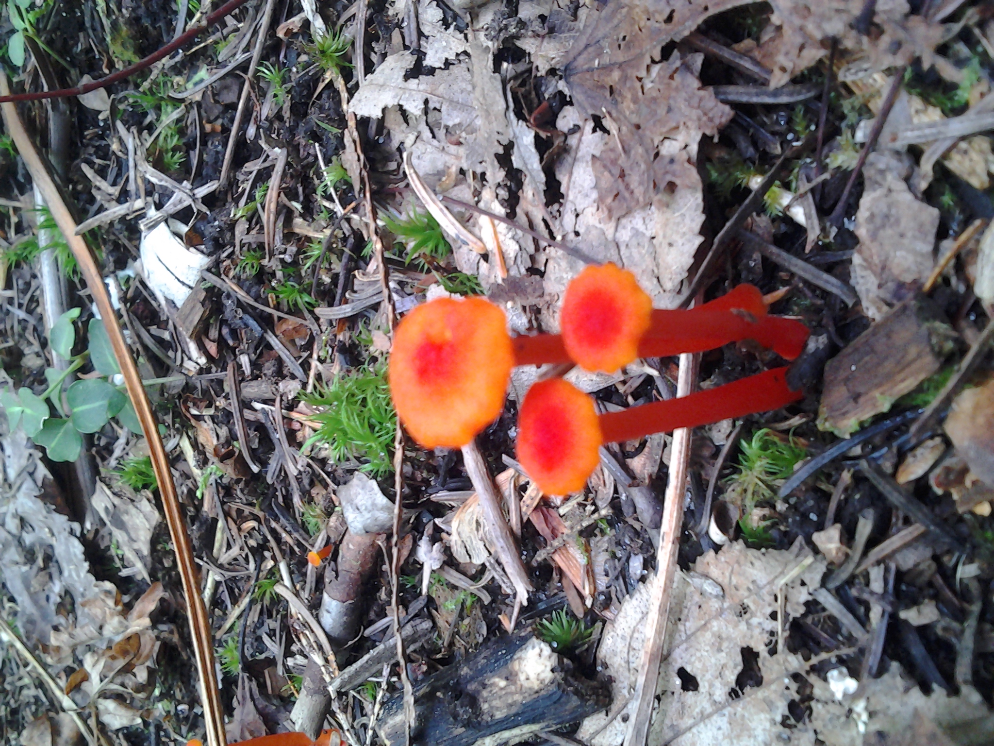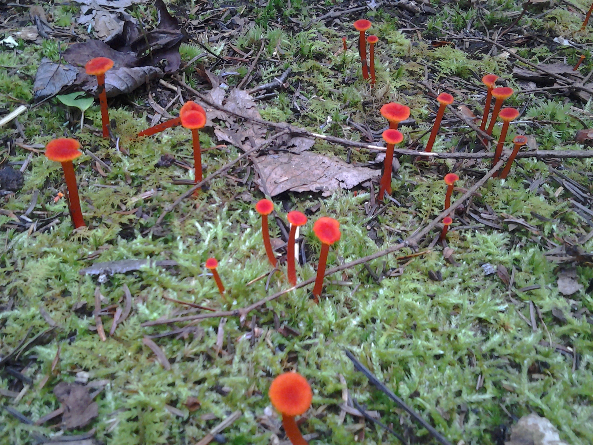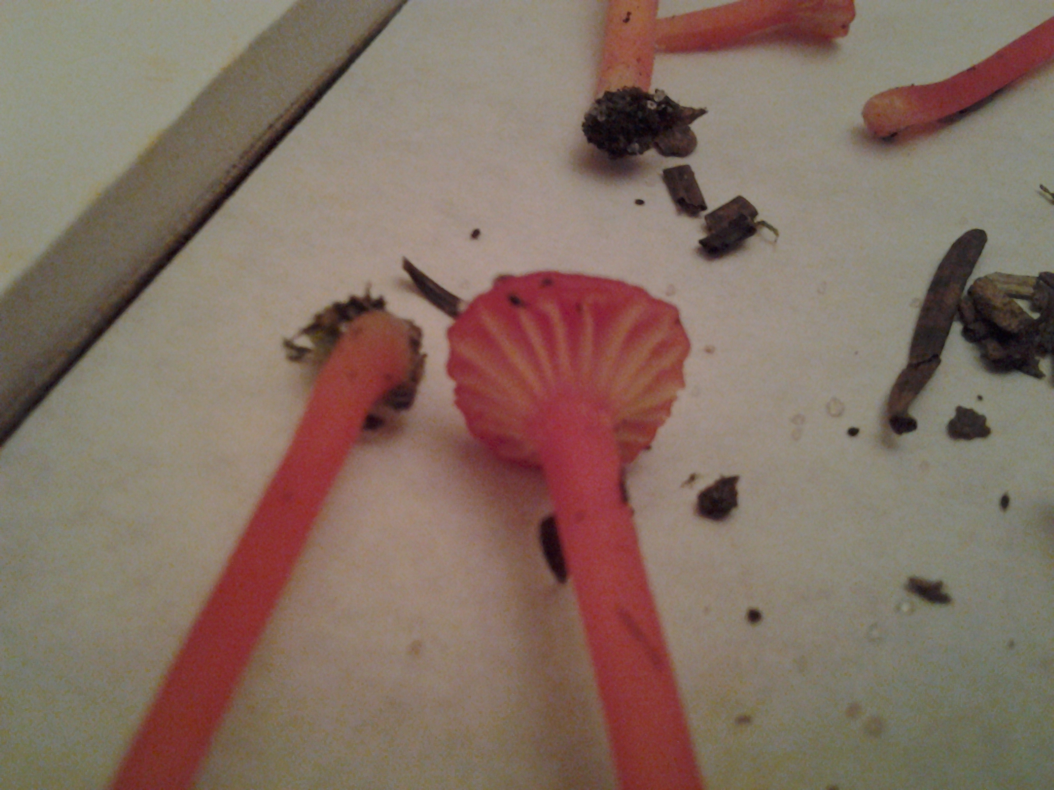 Cap small, to 2 cm wide, bright scarlet red. At first convex with a slightly icurved margin, soon flat or with a small central depression. Cap not viscid, fading to orange in age, particularly near the margin. Gills yellow w/orange tints, broadly attached or beginning to run down the stem, distant. Stem red with pink tones (lighter than pileus), dry, equal, to 5 cm long, turning whitish only at extreme base.