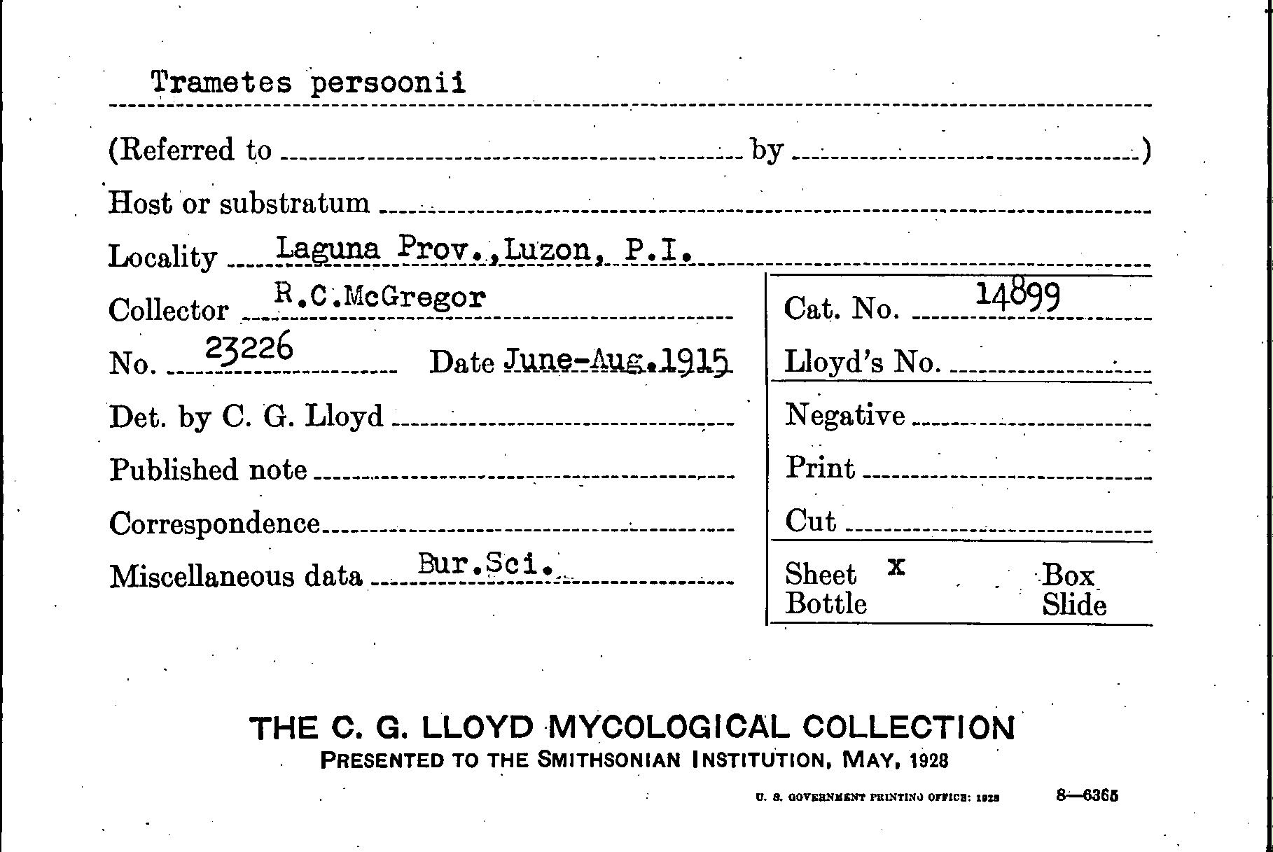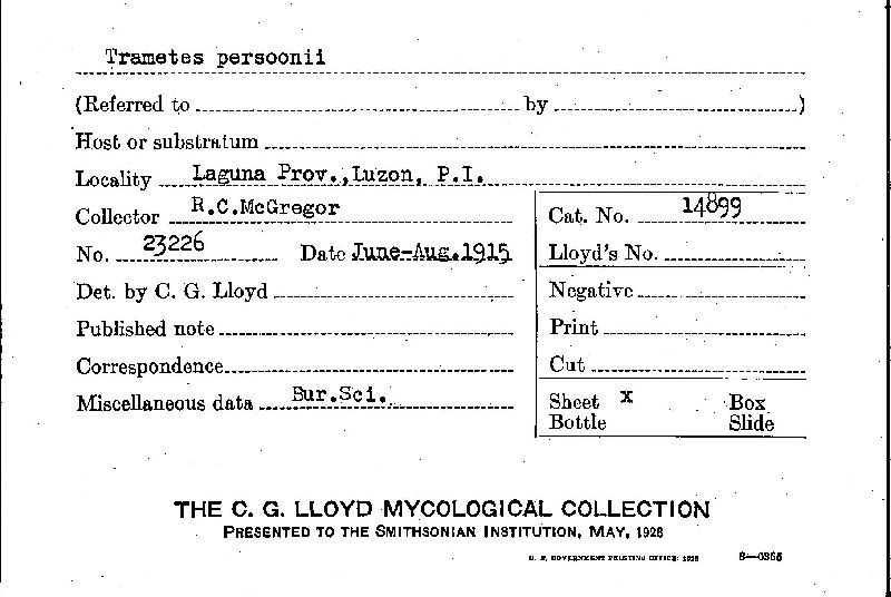 Index of the C.G. Lloyd Mycological Collection Specimens Housed at BPI (BPI)